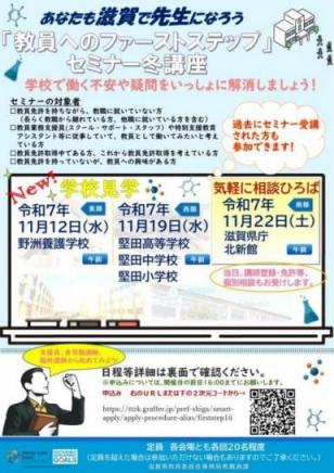そんな不安や疑問を解消し、教職への第一歩を踏み出してもらえるよう、「教員へのファーストステップセミナー」春講座を令和7年5月に実施し、2日間(滋賀県庁会場、米原市役所会場)で、のべ37名(実30名)に参加いただきました。