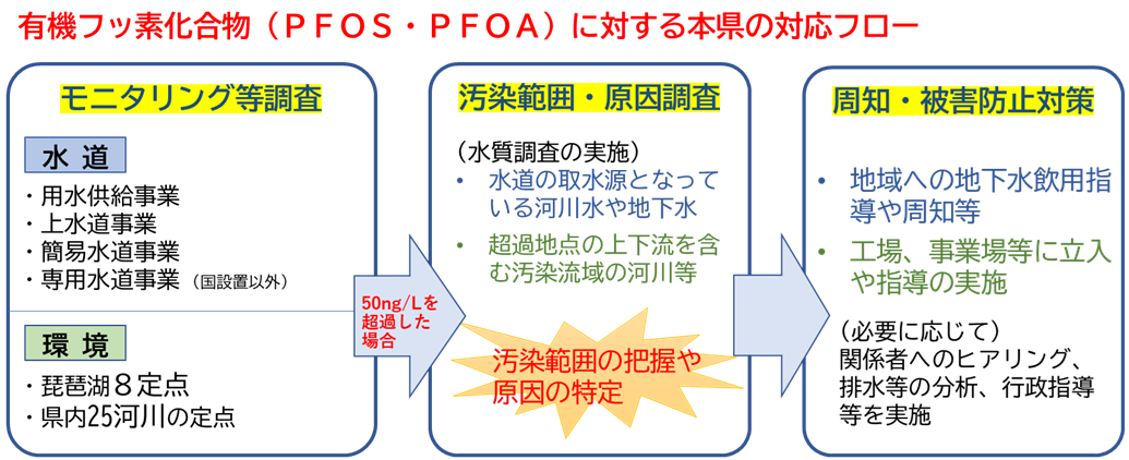 なお、令和7年7月に市民団体が大津市の和邇川支流において水質調査を実施した結果、PFOS及びPFOAが指針値を超えて検出されました。このことを受けて、大津市では、同支流において水質調査を実施し、その結果、指針値以下であることを確認しています。