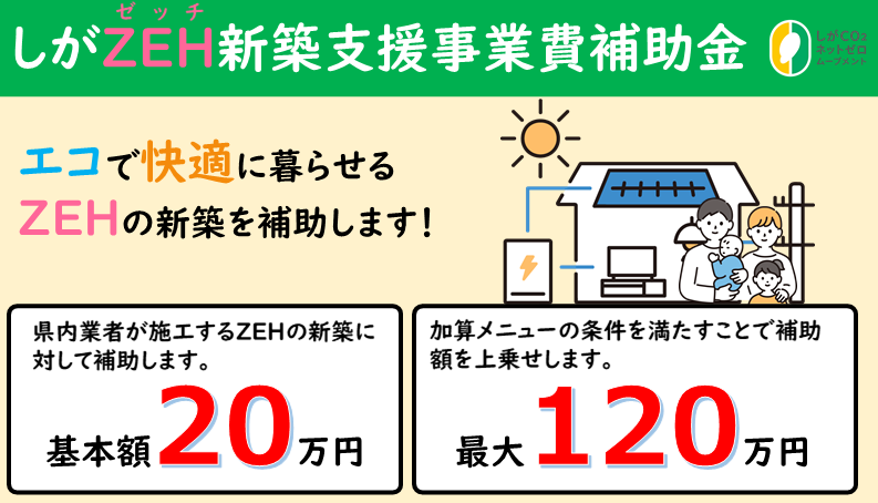 滋賀県では、CO2ネットゼロ社会づくりの推進および安全で持続可能なまちづくりを目指すため、ZEHの新築に対し基礎額20万円、加算メニューを組み合わせることで最大120万円を補助します。