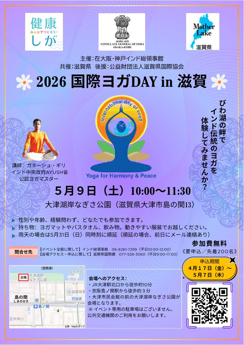 この度、在大阪・神戸インド総領事館との共催により、国連が定める国際ヨガの日を記念するヨガイベントを開催します。びわ湖の畔で、湖から吹く爽やかな風を感じながら、インドのヨガを体験してみませんか?