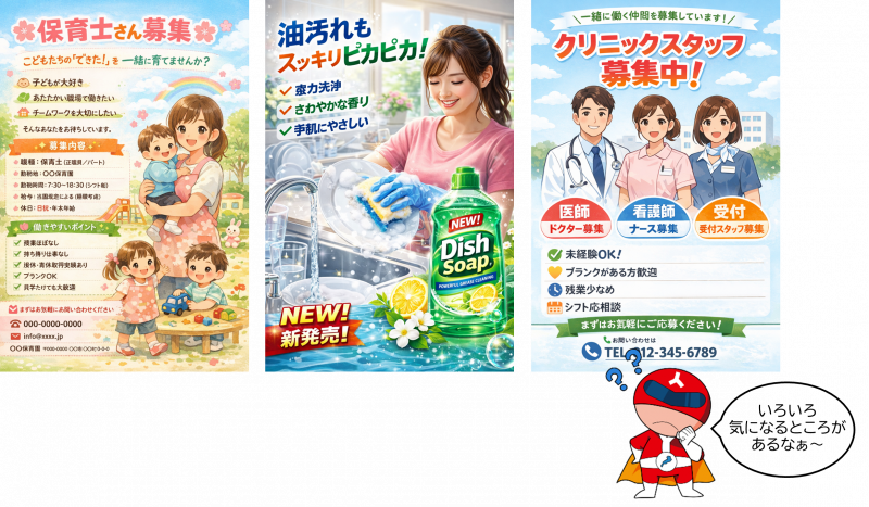 A.問題点:すべてのポスターで、性別によって服装が色分けされています。また、保育士・看護師は女性、医師は男性など、性別による役割分担意識が反映されていて、ジェンダーの問題が十分に学習されていない可能性があります。