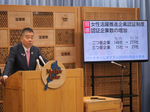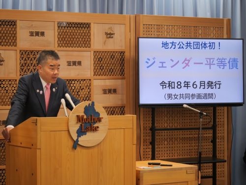 それでは、資料に基づきまして一点、ジェンダー平等債についてでございます。先ほどの訓示でも申し上げましたが、ジェンダー平等と多文化共生を大事にしていきます。そのうち、ジェンダー平等につきましては、パートナーしがプランに基づく取組を進めていきます。全国初となるジェンダー平等債を、男女共同参画週間に合わせた、今年の6月に発行をいたします。アンコンシャスバイアスをはじめ、地域社会、職場、様々な場面で未だジェンダーギャップが存在しています。それぞれ、一人ひとり、自分自身の希望する未来を、性別によって、もしかしたら諦めてしまったり、壁、天井があったりする人たちも多くいるのかもしれません。滋賀県では、性別にかかわらず、誰一人取り残さないジェンダー平等社会の実現を目指し、今年度、「パートナーしがプラン2030」を策定いたしました。このプランでは、男女間の賃金格差の縮小に向けた社会的関心を呼び込んで、理解と共感の輪の拡大を目指した具体的な数値目標を定めましたが、今回、その達成に向けた推進力とするため、地方公共団体では初めてとなる、ジェンダー平等債を発行するものでございます。地方債ですので、法的制約がございます。この法的制約がある中で発行いたしますジェンダー平等債は、目標とその達成状況に応じた対応をあらかじめ設定する「サスティナビリティ・リンク・ボンド」を採用いたします。一昨年から準備、検討してまいりましたが、今般、リンクボンドでの発行に必要な第三者機関からの適合性の確認が、おかげさまで得られたという情報が入りました。今回のジェンダー平等債は、先ほど申し上げたプランに基づきまして、「女性活躍推進企業認証制度」の認証企業数をその目標といたしまして、達成できなかった場合、本県のジェンダー平等に資する事業の財源となる基金に対して追加・拠出をするという条件を設定させていただいております。このジェンダー平等債の発行を機にですね、経済界、投資家の皆さんの共感や賛同と、「パートナーしがプラン2030」の取組を着実に進めることによって、先ほど申し上げた一人ひとりが幸せを感じることのできる滋賀を目指してまいりたいと思っておりますので、報道機関各位の御取材や御報道賜れれば幸いでございます。私からは以上です。
