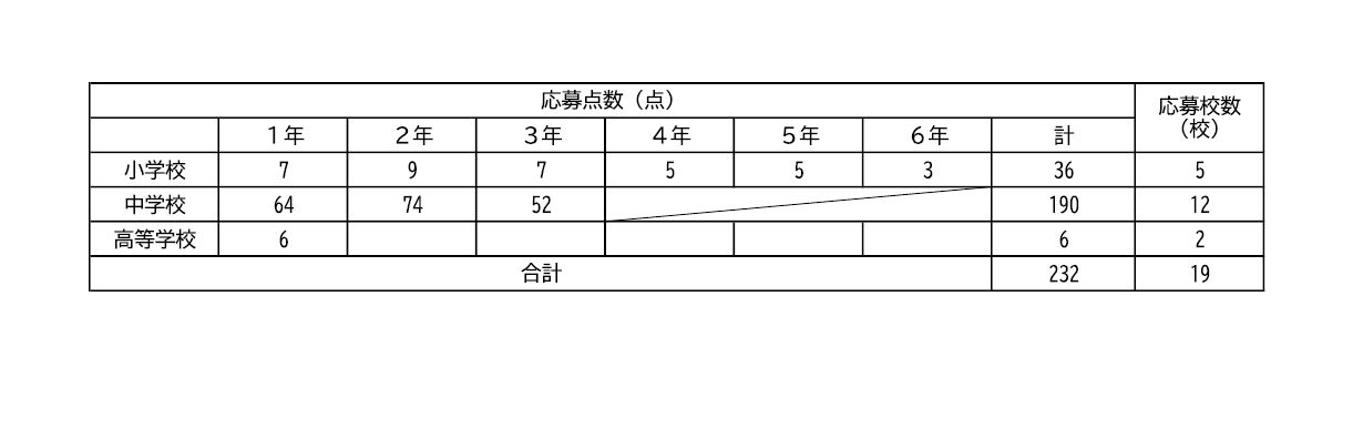 今年度、県内の小学校、中学校、義務教育学校、高等学校、中等教育学校および特別支援学校の児童・生徒を対象に募集を行ったところ232点の応募があり、審査会において20点を受賞作品として選定しました。