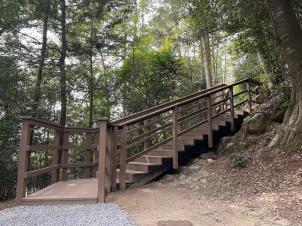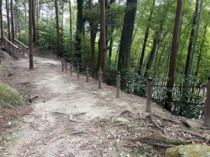 滋賀県では、謎に包まれた安土城の実像を解明し、目に見える形で復元することで、安土城の価値や魅力をより多くの人に知ってもらい、地域の活性化につなげることを目指して、令和元年度(2019)から「幻の安土城」復元プロジェクトに取り組んでいます。その中で、令和5年度から、20年計画で特別史跡安土城跡調査整備事業に着手し、発掘調査と環境整備を進めています。令和7年度は、百々橋口から伝羽柴秀吉邸跡にいたる山腹道の園路整備を実施しました。