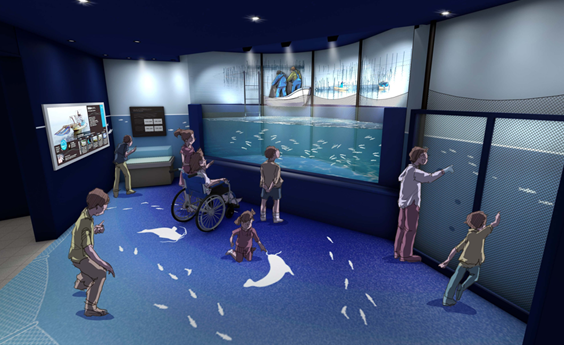 新コアユ水槽は、琵琶湖の代表的な漁の一つである「エリ漁」をイメージした水槽で、エリ漁で実際に使う網なども展示し、漁業との関わりを紹介します。