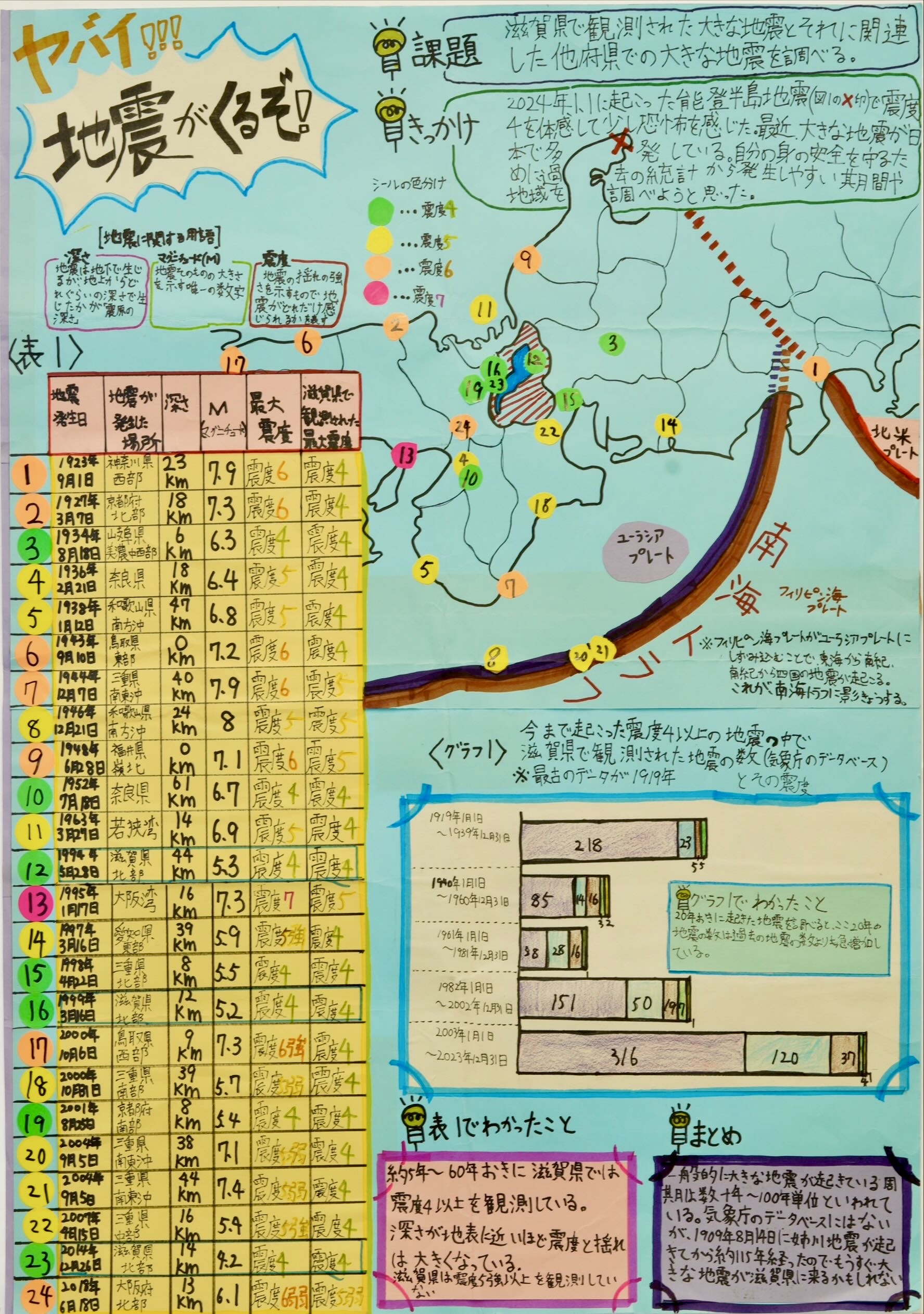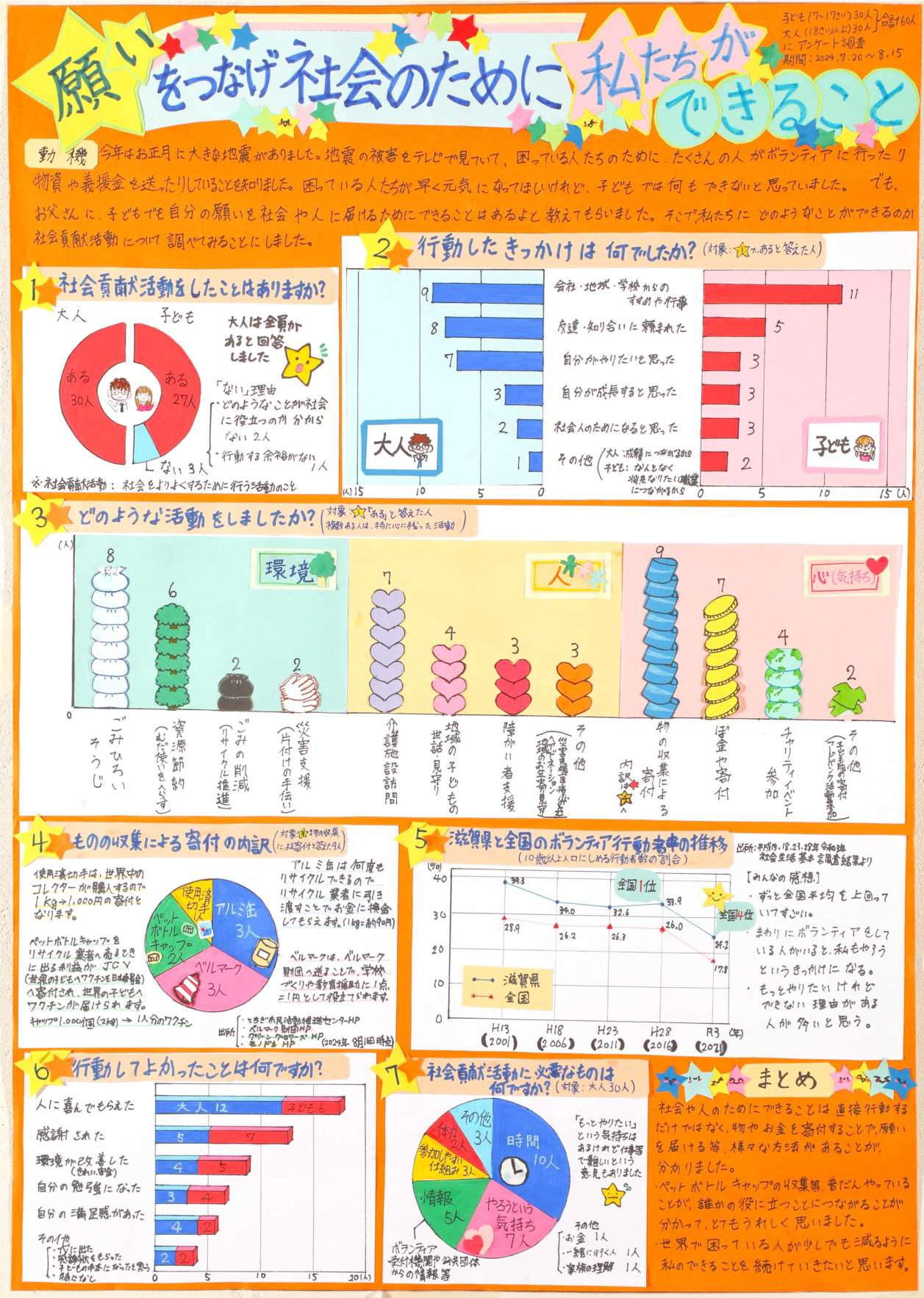 1月に起きた能登半島地震をきっかけに、「社会貢献活動」をテーマにいろいろな視点から調べることができていました。社会貢献活動をしている方への聞き取り調査で集まったデータを「大人」と「子ども」であったり、「直接的な支援」と「間接的な支援」であったり、視点を分けてまとめられている点はよかったと思います。色づかいやイラストについても工夫されており、まとまりのあるデザインでした。まとめでは、社会貢献活動に対する前向きな気持ちを感じることができました。