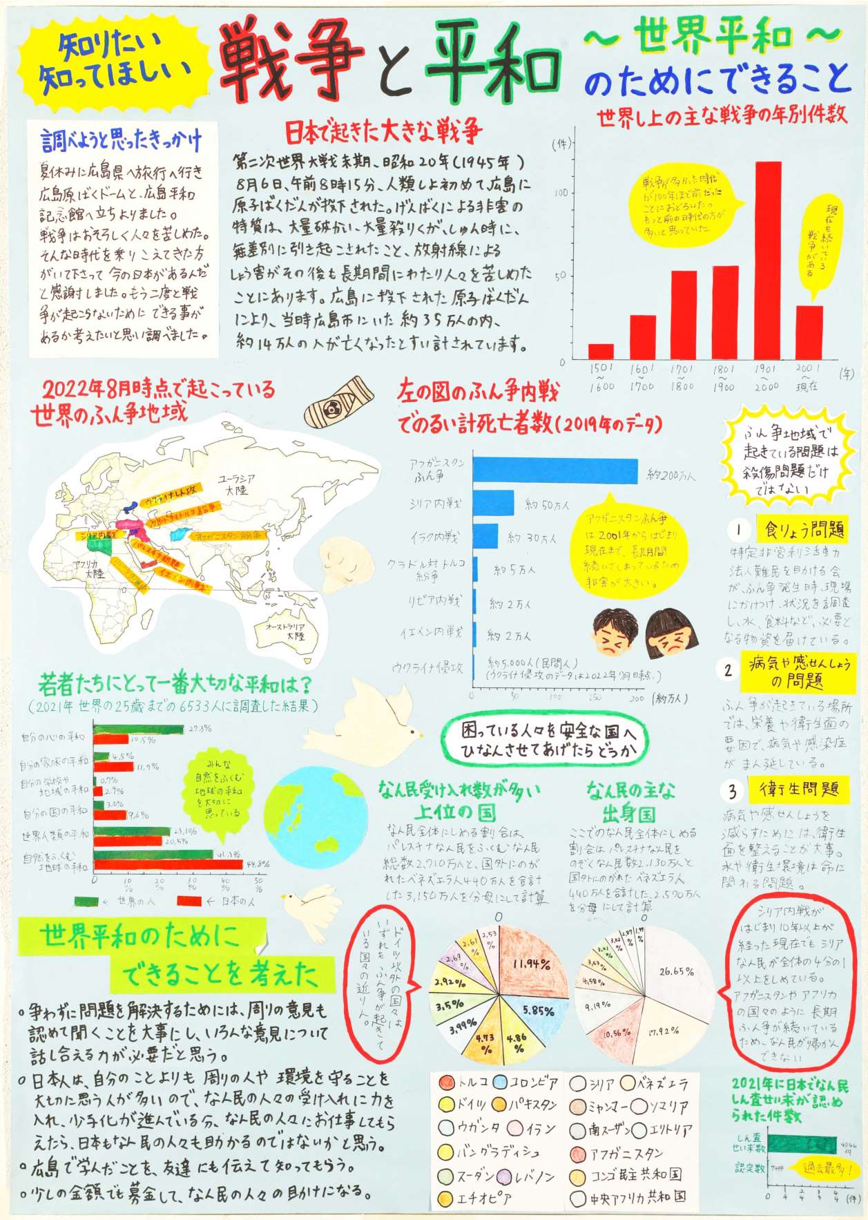 「戦争と平和」をテーマに、これまで起こった戦争の年別件数や、今もなお起きている戦争による食料問題や難民問題など、様々な視点から平和について考えさせられる作品でした。集めた多くのデータを、円グラフや棒グラフなど、多様な形で表したり、色を分けて見やすくしたり、たいへん工夫されたデザインでした。最後には、調べてきた内容を基に、世界平和のために必要な解決策についても具体的に書かれていることもよかったと思います。