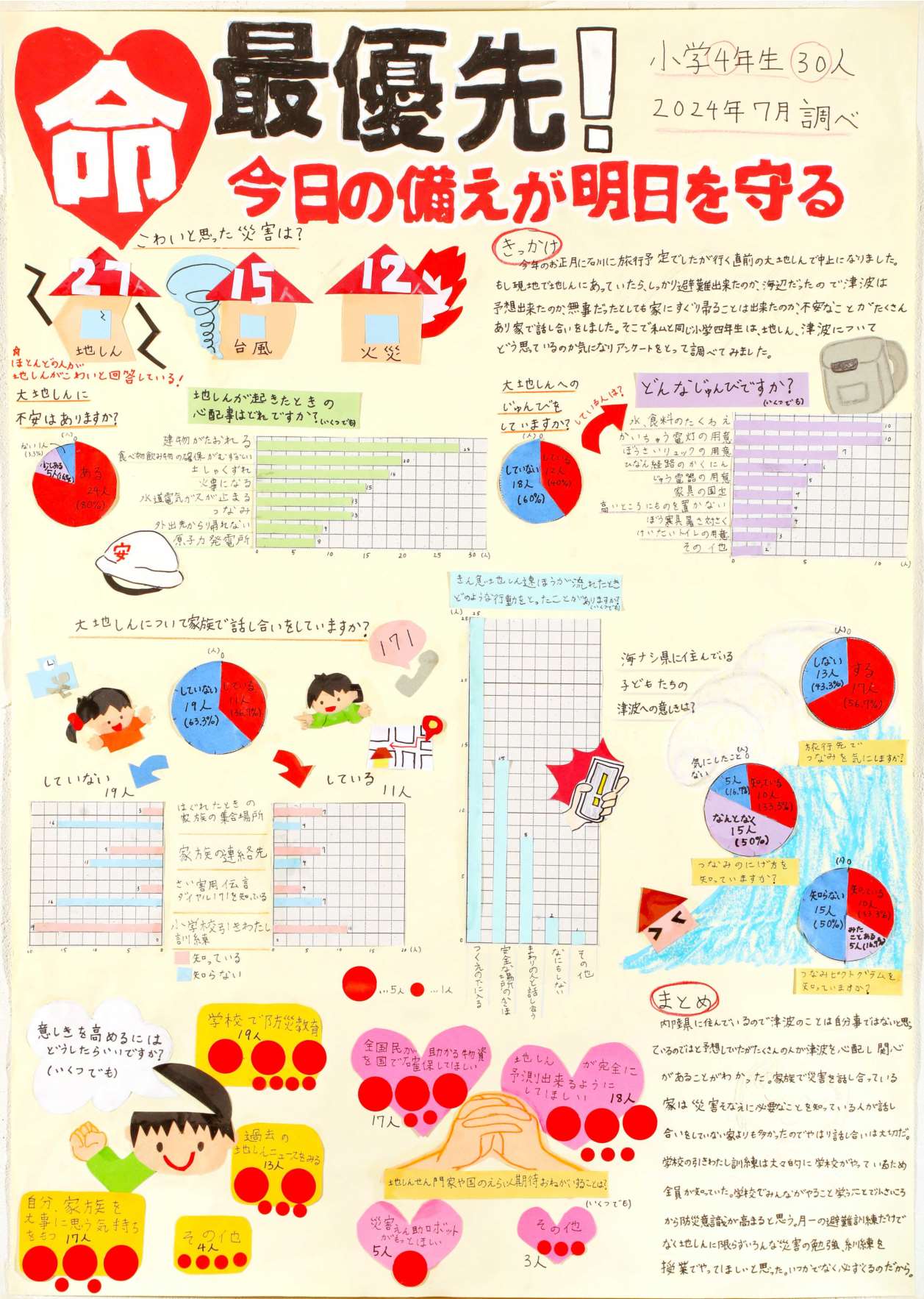 大きな地震があり、防災に関する関心も高くなっています。石川県への旅行の直前に地震が起こって、旅行が中止になったという経験から、「命を守る」というテーマを中心において作品を組み立てていたところが素晴らしかったです。調べた項目によってグラフの種類を変えて、見る人に伝わりやすくする工夫をしていたところも良かったです。