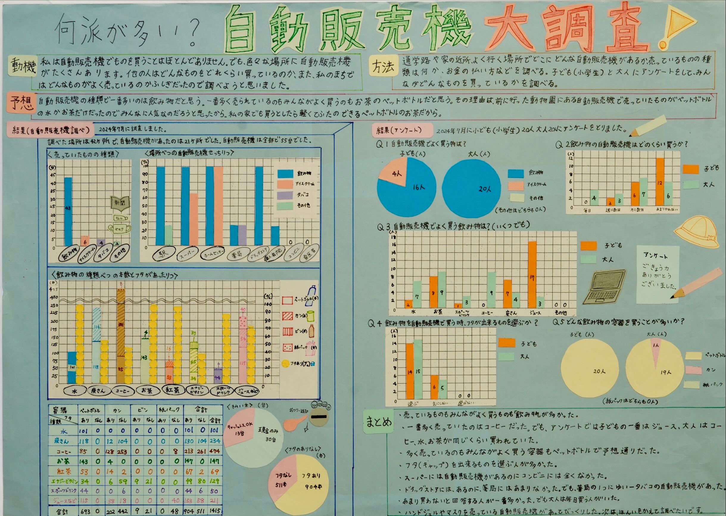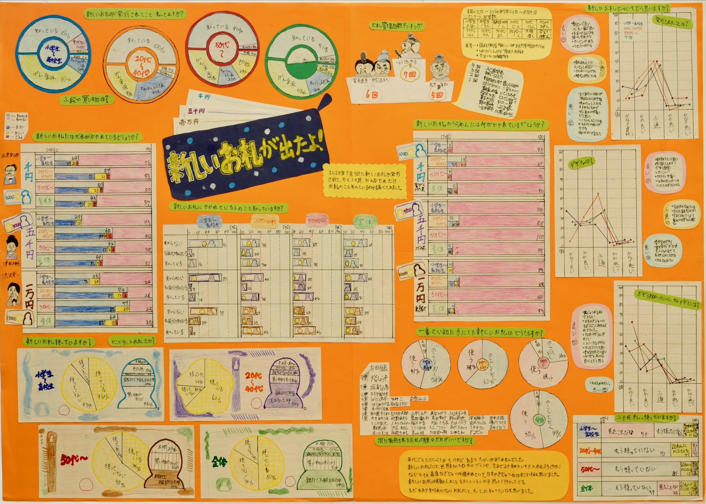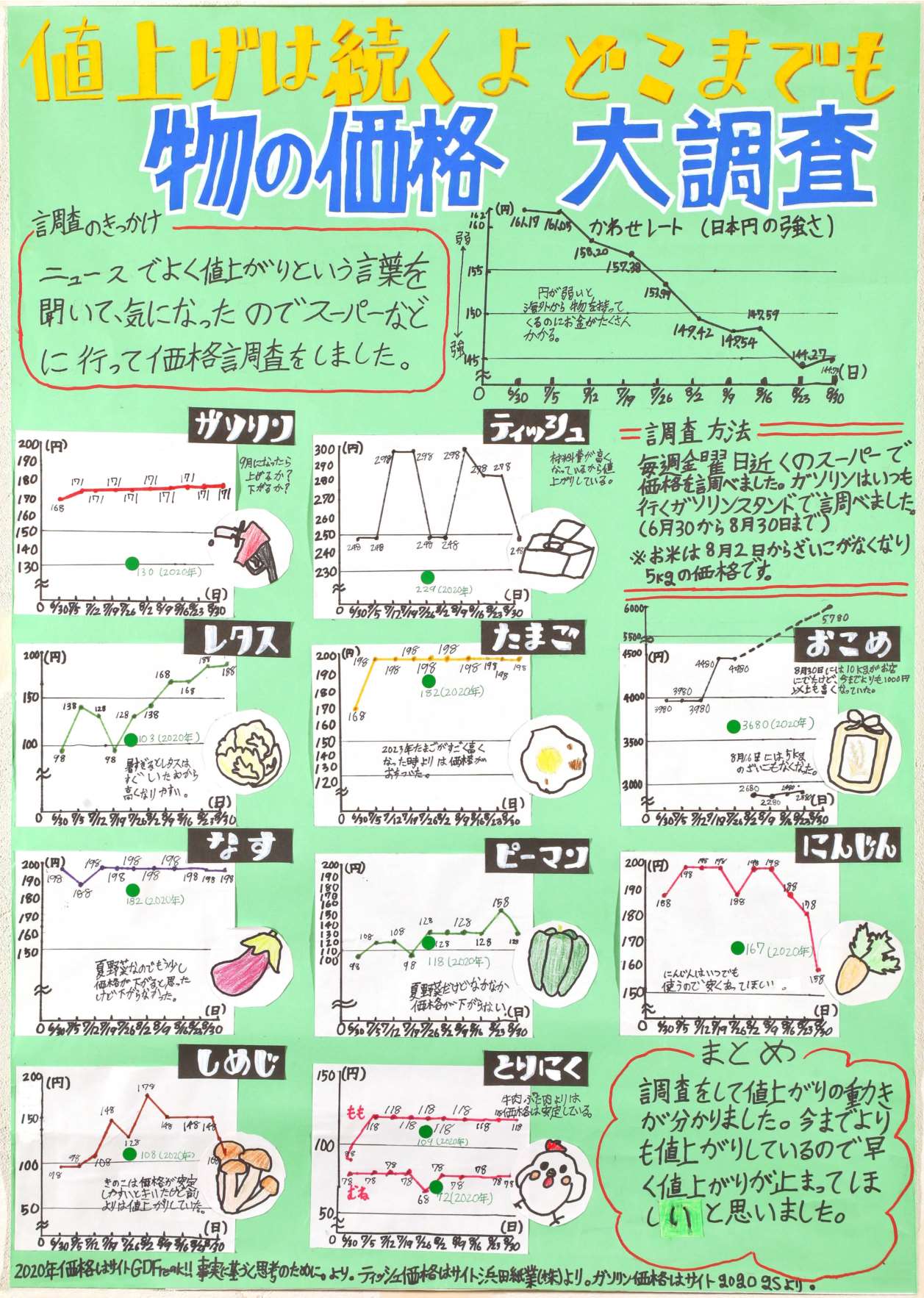 ニュースを見るたびに「値上げ、値上げ」という言葉を聞く夏でしたね。毎週金曜日にスーパーへ通い、物の値段を調べる「大調査」の結果をまとめてくれました。気候で値段が変わるものや、そうでないものなど調べてみてわかることもありましたね。2020年の値段をシールで入れることで、今年の値段がどれだけ高いかがよくわかりました。「変化」を表すのに適した折れ線グラフを使ったことも良かったです。