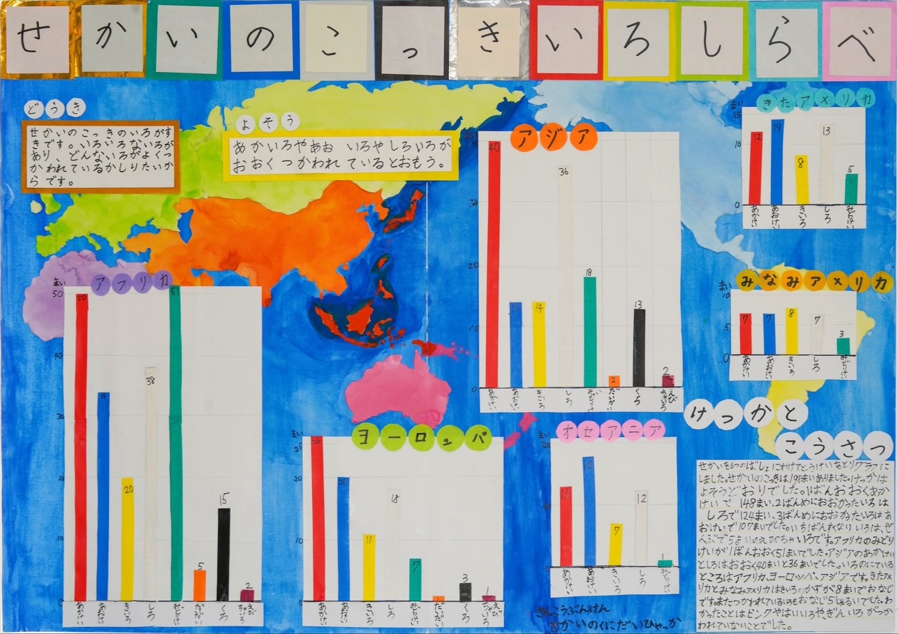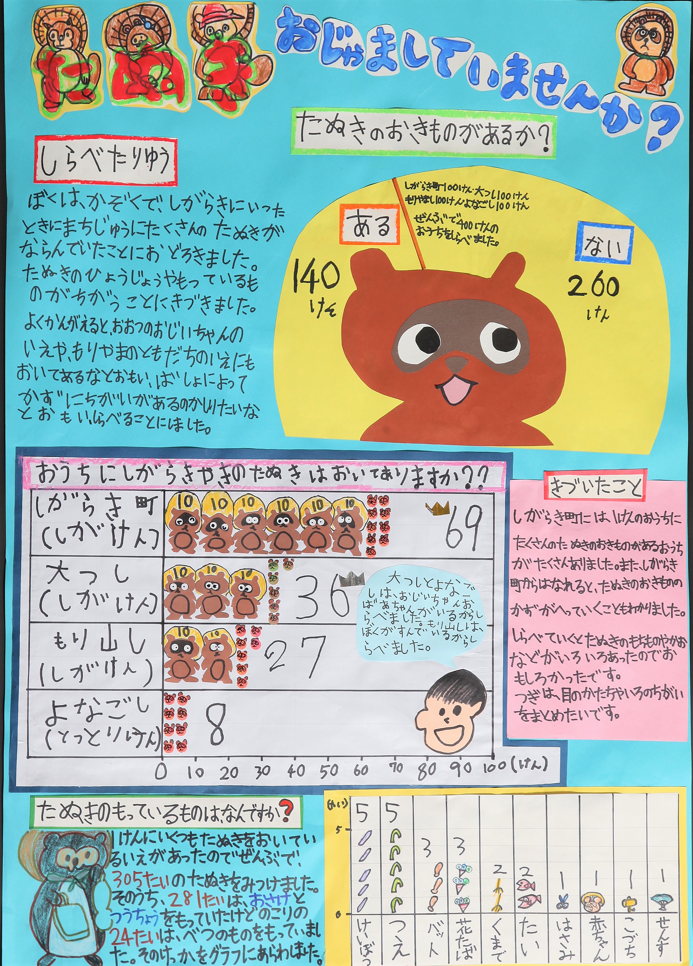全国的にも有名となった信楽の狸ですが、家族と出かけた思い出をもとにして、調査を始めている点が大変素晴らしいです。毎日過ごしている守山市、おじいちゃん・おばあちゃんが住んでいる大津市と米子市を、一軒一軒まわって、根気強く、丁寧に調べることができましたね。信楽での驚きや各地で置物を見付けた時の喜びが伝わってくる作品でした。たぬきの絵を使って、見付けた数を分かりやすくまとめることもできていました。調査を通して、信楽から遠く離れるほど、置物が少なくなることに気付けたことはお見事です。
