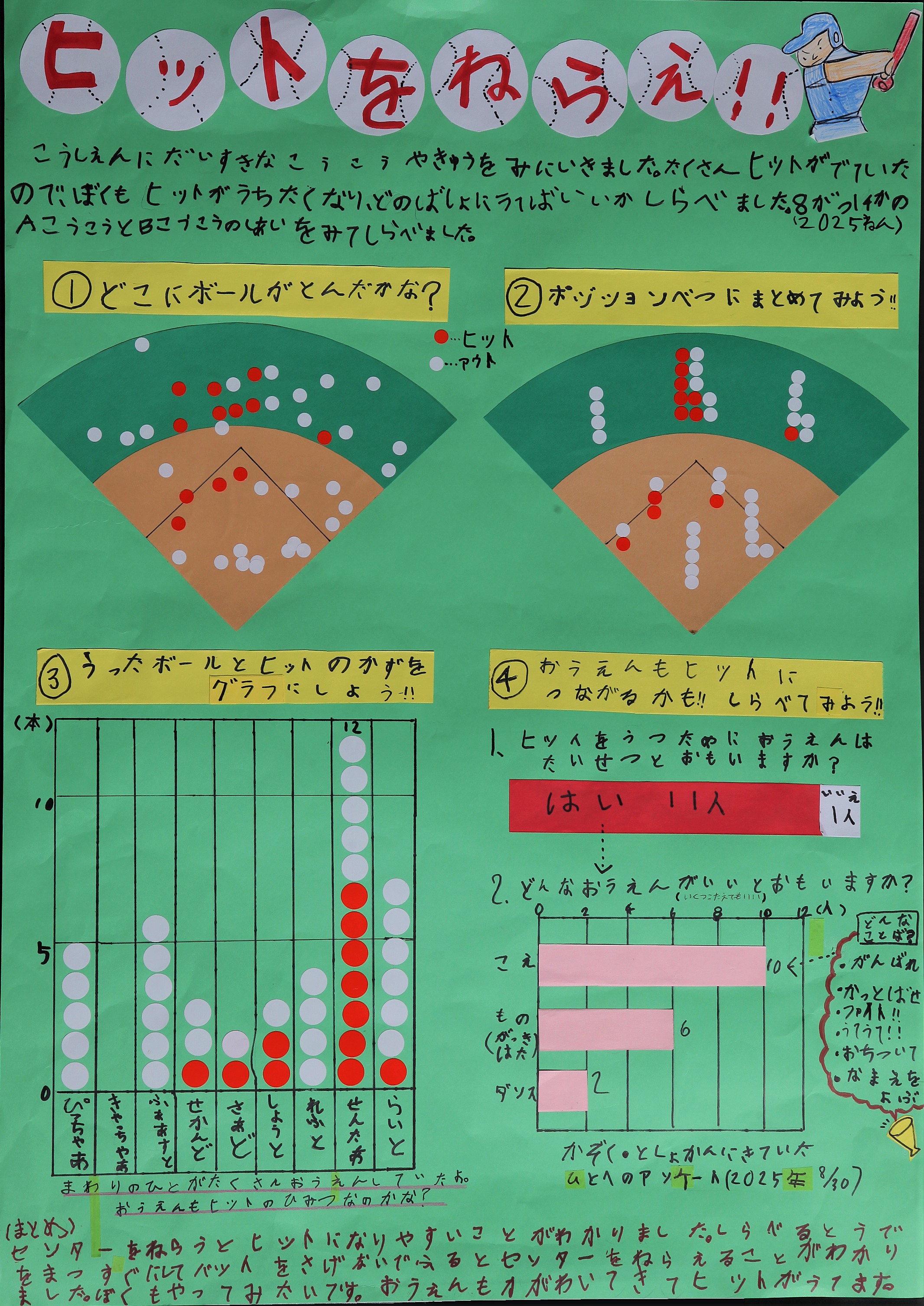 歩数を気にかけている家族の姿をよく観察し、自分事に置き換えて疑問を見つけている点に感心しました。天気も気温も日々変わる中での調査は簡単にはいかないものですが、万歩計を手に、集中してねばり強く歩数を数え、正確な数値としてまとめることができましたね。歩数や天候に加え、かかった時間や到着時刻なども正確に記録されており、信頼性の高い作品に仕上げることができています。調査を通して金曜日は歩数が多くなることを発見し、その原因を分析した上で対策まで考えられている点も素晴らしく、大変評価できます。