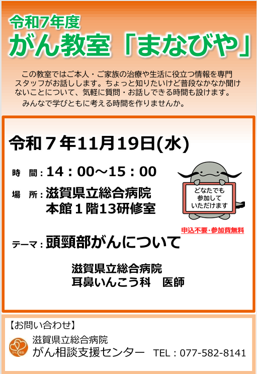 滋賀県立総合病院では「がんの病態、標準的治療法等がん診療及びがんの予防・早期発見等に関する一般的な情報の提供」の一環としてがん教室を開催します。