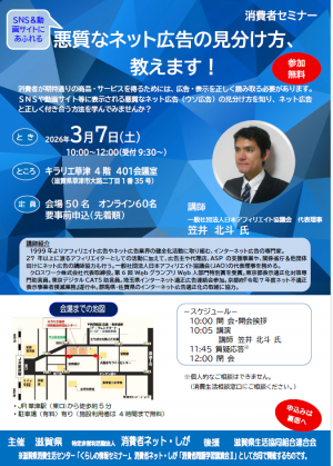 滋賀県消費生活センターでは、特定非営利活動法人消費者ネット・しがとの共催により、SNSや動画サイト等に表示される悪質なネット広告(ウソ広告)の見分け方を学ぶセミナーを開催します。